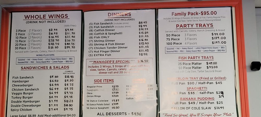 - Dinners: Savor options like the 5 Fish Sandwich Combo, complete with a drink for just $8.25, or indulge in the classic Catfish and Spaghetti for $11.89.